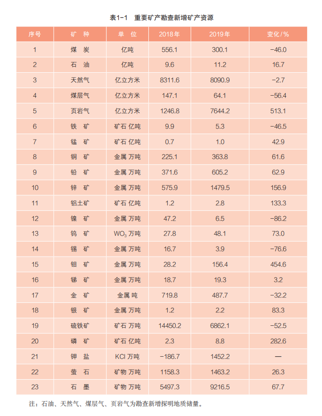 2019年,石油新增探明地質(zhì)儲量11.2億噸,其中,新增探明技術(shù)可采儲量1.6億噸。頁巖氣新增探明地質(zhì)儲量 7644.2 億立方米,其中,新增探明技術(shù)可采儲量 1838.4 億立方米。煤炭新增300.1億噸,較上年明顯下降。主要金屬礦產(chǎn)中錳礦、銅礦、鉛礦、鋅礦、鎢礦、鉬礦、銀礦等新增明顯,鐵礦、鎳礦、錫礦、金礦明顯下降。非金屬礦產(chǎn)中磷礦、石墨明顯增長。