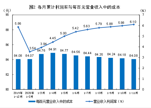 1—11月份,規(guī)模以上工業(yè)企業(yè)每百元營業(yè)收入中的成本為84.08元,同比減少0.01元;每百元營業(yè)收入中的費用為8.92元,同比增加0.12元。