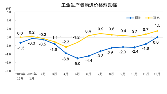 2020年12月份,全國工業(yè)生產(chǎn)者出廠價格同比下降0.4%,環(huán)比上漲1.1%;工業(yè)生產(chǎn)者購進(jìn)價格同比持平,環(huán)比上漲1.5%。2020年全年,工業(yè)生產(chǎn)者出廠價格比上年下降1.8%,工業(yè)生產(chǎn)者購進(jìn)價格下降2.3%。