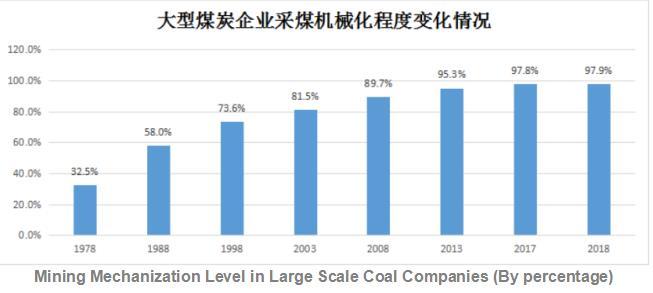 煤炭生產(chǎn)方面,從1978年至2019年,大型煤炭企業(yè)采煤機(jī)械化程度由32%提高到96%;全國(guó)煤礦人均生產(chǎn)效率由137噸/年提高到1000噸/年;建成了年產(chǎn)120萬(wàn)噸及以上的大型現(xiàn)代化煤礦1200處左右,煤炭產(chǎn)量占全國(guó)的80%以上;建成了千萬(wàn)噸級(jí)煤礦42處,產(chǎn)能6.7億噸/年。