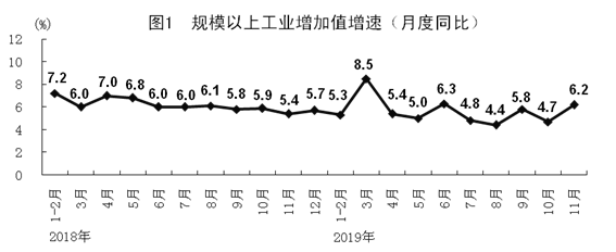 11月份,全國規(guī)模以上工業(yè)增加值同比增長6.2%,增速比上月加快1.5個百分點。1-11月份,全國規(guī)模以上工業(yè)增加值增長5.6%,增速與1-10月份持平。分經(jīng)濟類型看,11月份,國有控股企業(yè)增加值增長3.7%;股份制企業(yè)增長7.0%,外商及港澳臺商投資企業(yè)增長3.2%;私營企業(yè)增長8.9%,增速比上月加快3.5個百分點。分三大門類看,采礦業(yè)增加值增長5.7%,制造業(yè)增長6.3%,電力、熱力、燃氣及水生產(chǎn)和供應(yīng)業(yè)增長6.7%。高技術(shù)制造業(yè)、裝備制造業(yè)增加值分別增長8.9%、8.5%,分別比規(guī)模以上工業(yè)快2.7、2.3個百分點;其中醫(yī)療儀器設(shè)備及儀器儀表制造業(yè)、電子及通信設(shè)備制造業(yè)分別增長12.6%和10.8%,分別比規(guī)模以上工業(yè)快6.4和4.6個百分點。太陽能電池和集成電路產(chǎn)量分別增長23.0%和18.2%。汽車產(chǎn)量增長3.7%。制造業(yè)采購經(jīng)理指數(shù)(PMI)分項指數(shù)中,生產(chǎn)指數(shù)、新訂單指數(shù)和供應(yīng)商配送時間指數(shù)分別為52.6%、51.3%和50.5%,均高于臨界點且均比上月有所回升。制造業(yè)生產(chǎn)經(jīng)營活動預(yù)期指數(shù)為54.9%,位于較高景氣區(qū)間。