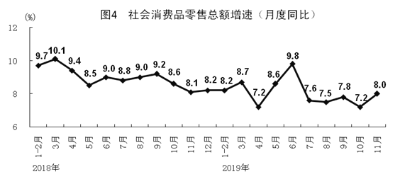 11月份,社會消費品零售總額38094億元,同比增長8.0%,增速比上月加快0.8個百分點。其中,扣除汽車以外的社會消費品零售總額增長9.1%。1-11月份,社會消費品零售總額372872億元,同比增長8.0%。按經(jīng)營單位所在地分,11月份,城鎮(zhèn)消費品零售額32345億元,增長7.9%;鄉(xiāng)村消費品零售額5748億元,增長9.1%。按消費類型分,餐飲收入4964億元,增長9.7%;商品零售33130億元,增長7.8%。消費升級類商品較快增長。限額以上單位化妝品類、飲料類和通訊器材類商品分別增長16.8%、13.0%和12.1%,增速分別快于全部社會消費品零售總額8.8、5.0和4.1個百分點。