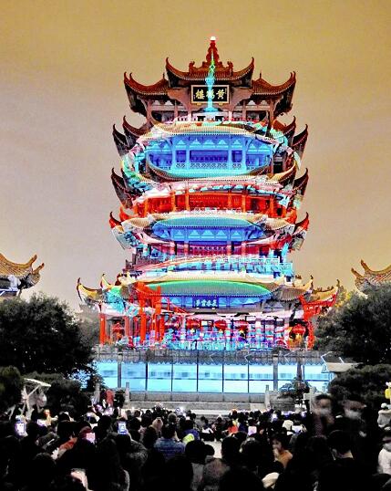 △10月7日晚,來(lái)自全國(guó)各地的抗疫英雄、游客及武漢市民在黃鶴樓前觀看大型實(shí)景光影秀《夜上黃鶴樓》