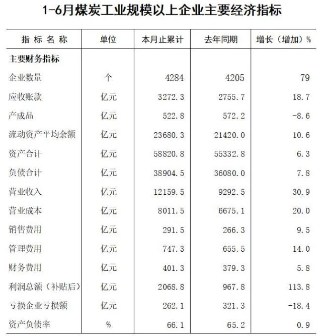 指標(biāo)顯示,上半年4284家規(guī)模以上煤炭企業(yè)營業(yè)收入12159.5億元,同比增長30.9%,增幅比規(guī)模以上工業(yè)行業(yè)平均高3個百分點;營業(yè)成本8011.5億元,同比增長20.0%;應(yīng)收賬款3272.3億元,同比增長18.7%;利潤總額(補貼后)2068.8億元,同比增長113.8%。